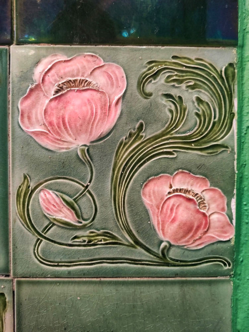 Reliefowa, wyciskana płytka – secesyjny kafelek z motywem maków. Ma już ponad sto lat! Powstał około 1900 roku w słynnej Sächsische Ofen- und Schamottewarenfabrik w Miśni. Kiedyś zdobił sklep rzeźniczy, a dziś… można go znaleźć w serwisie elektronicznym w samym centrum Szczecina. (Krzywoustego 53)