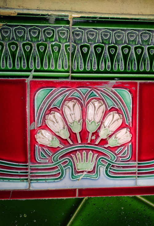To secesyjne płytki z willi rodziny Nestlerów w Łodzi. Zachwyca mnie ich motyw łabędzi. Po krótkim śledztwie ustaliłem, że pochodzą z okolic 1900 roku i zostały wyprodukowane przez MeiBner Ofen und Porzelan Fabrik (M.O.P.F.). W oryginalnej formie komplet tworzyło sześć ceramicznych płytek ułożonych w dwóch rzędach. W łódzkiej willi wykorzystano jedynie trzy, zestawione w ciągłe pasmo, które zdobiło całe pomieszczenie. Dziś w tym budynku mieści się przedszkole, a prezentowany detal stanowi ozdobę jednej z łazienek.