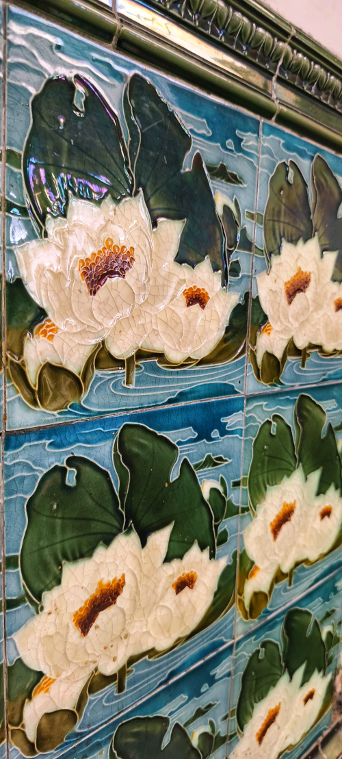 Na zdjęciu widać dekoracyjne kafle ścienne w stylu secesyjnym. Płytki przedstawiają duże, białe kwiaty – nenufary – na tle ciemnozielonych liści i turkusowego nieba z delikatnym motywem fal. Charakterystyczne są spękania szkliwa (tzw. efekt craquelure), które podkreślają ich wiek i zabytkowy charakter. Możesz je zobaczyć w Pałacu Scheiblerów przy ul. Piotrkowskiej 266 w Łodzi, będącym obecnie własnością Politechniki Łódzkiej. Niedawno ogłoszono, że ten pałac – wraz z dwiema innymi zabytkowymi willami należącymi do uczelni – przejdzie gruntowną renowację, co ma przywrócić blask oryginalnym detalom architektonicznym, w tym pięknym kaflom.