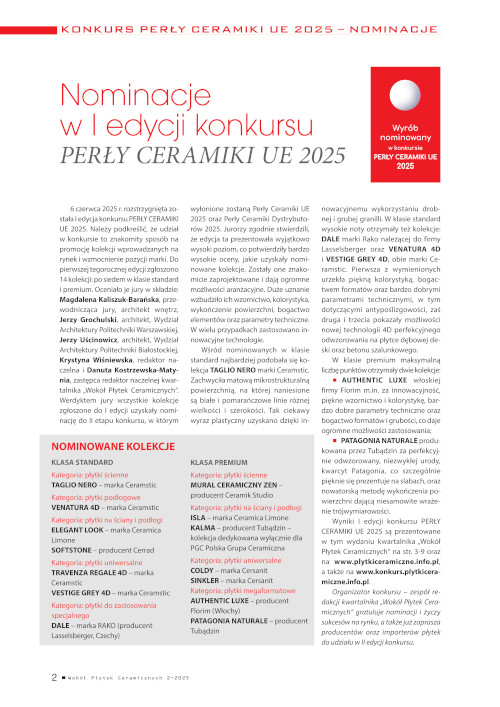 Nominacje w I edycji konkursu PERŁY CERAMIKI UE 2025 Wokół Płytek Ceramicznych nr 2/2025, strona 2-9 Spis treści >>>