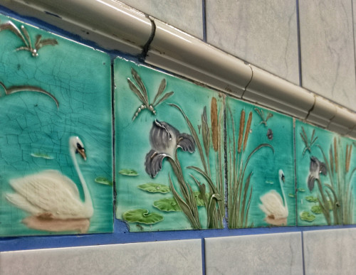 To secesyjne płytki z willi rodziny Nestlerów w Łodzi. Zachwyca mnie ich motyw łabędzi. Po krótkim śledztwie ustaliłem, że pochodzą z okolic 1900 roku i zostały wyprodukowane przez MeiBner Ofen und Porzelan Fabrik (M.O.P.F.). W oryginalnej formie komplet tworzyło sześć ceramicznych płytek ułożonych w dwóch rzędach. W łódzkiej willi wykorzystano jedynie trzy, zestawione w ciągłe pasmo, które zdobiło całe pomieszczenie. Dziś w tym budynku mieści się przedszkole, a prezentowany detal stanowi ozdobę jednej z łazienek.